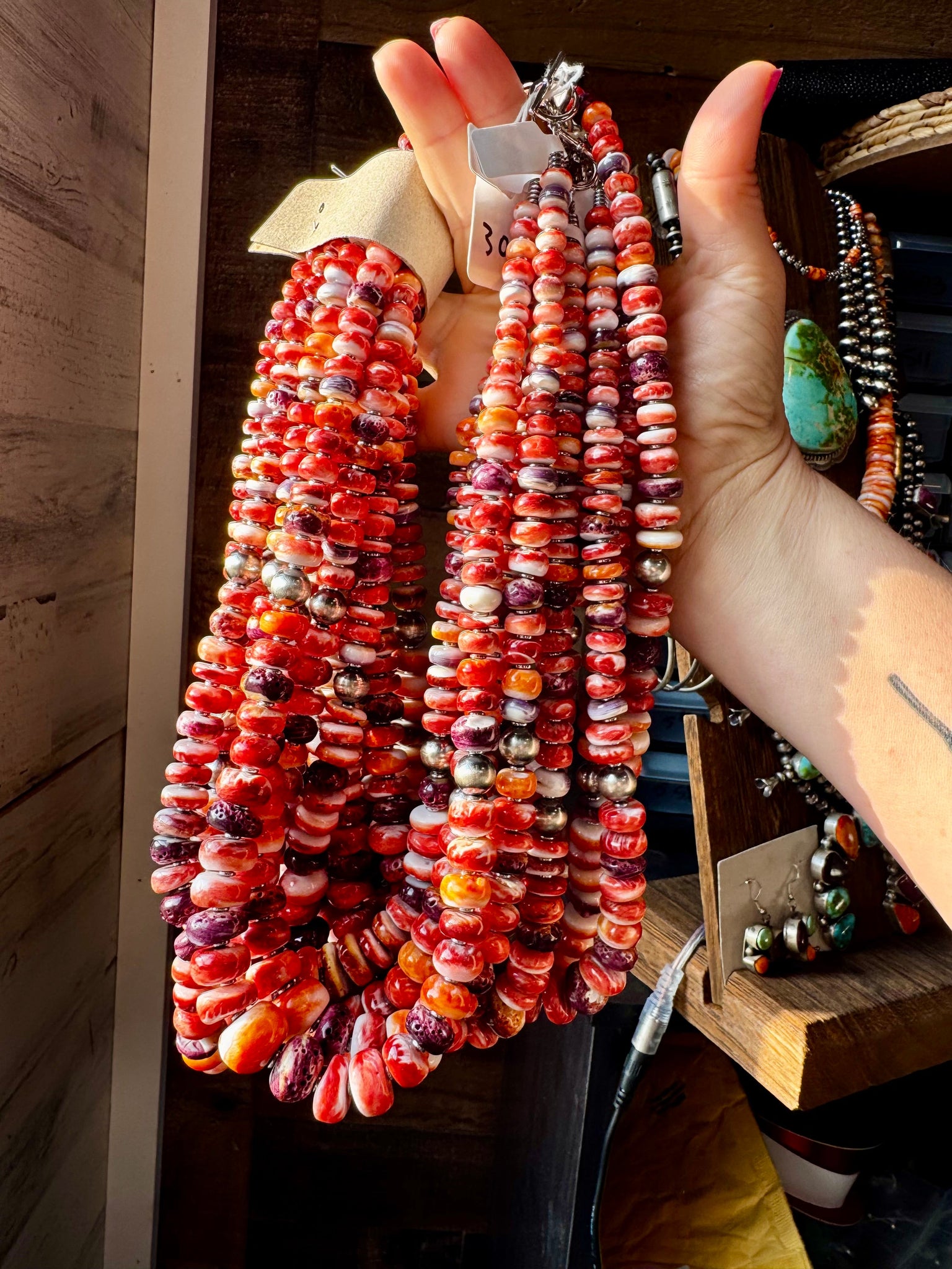 Beads: Mixed spiny oyster (orange, red, purple), purple wampum, 10mm sterling pearls, hematite saucers
