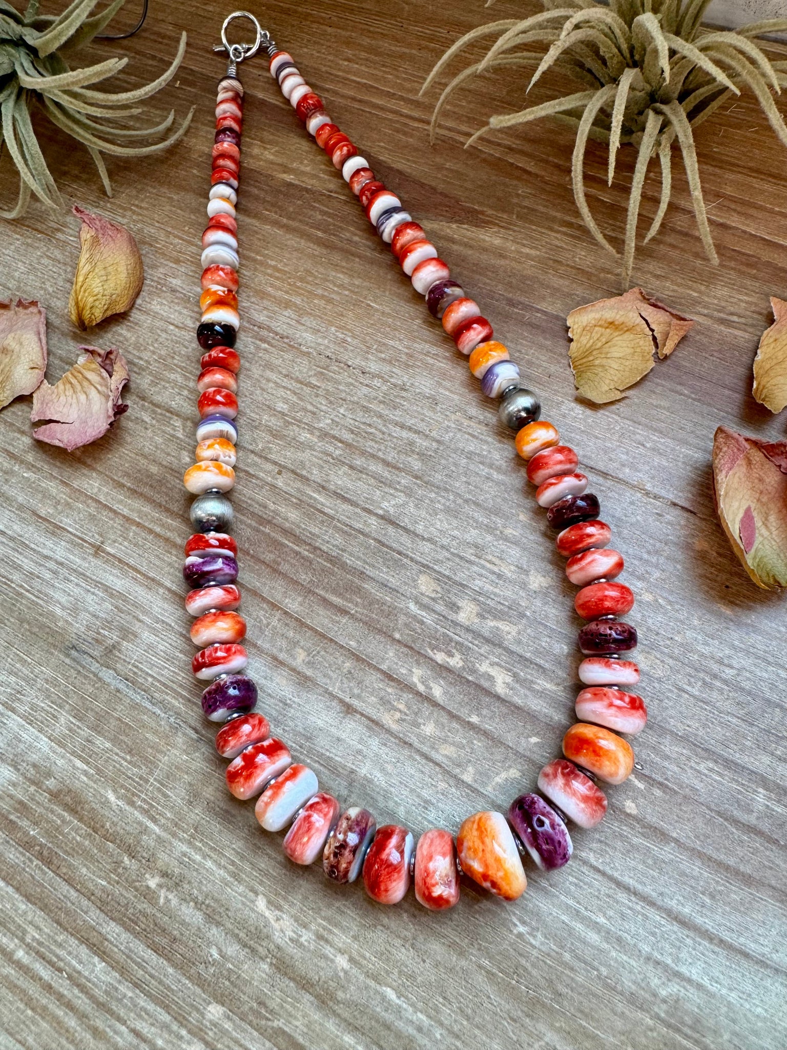 This exclusive 22-inch necklace features a rare mix of spiny oyster beads in vibrant orange, red, and purple, paired with deep-toned purple wampum shell. Spaced with hematite saucers and finished with two bold 10mm sterling silver pearls, this piece is a showstopper.
