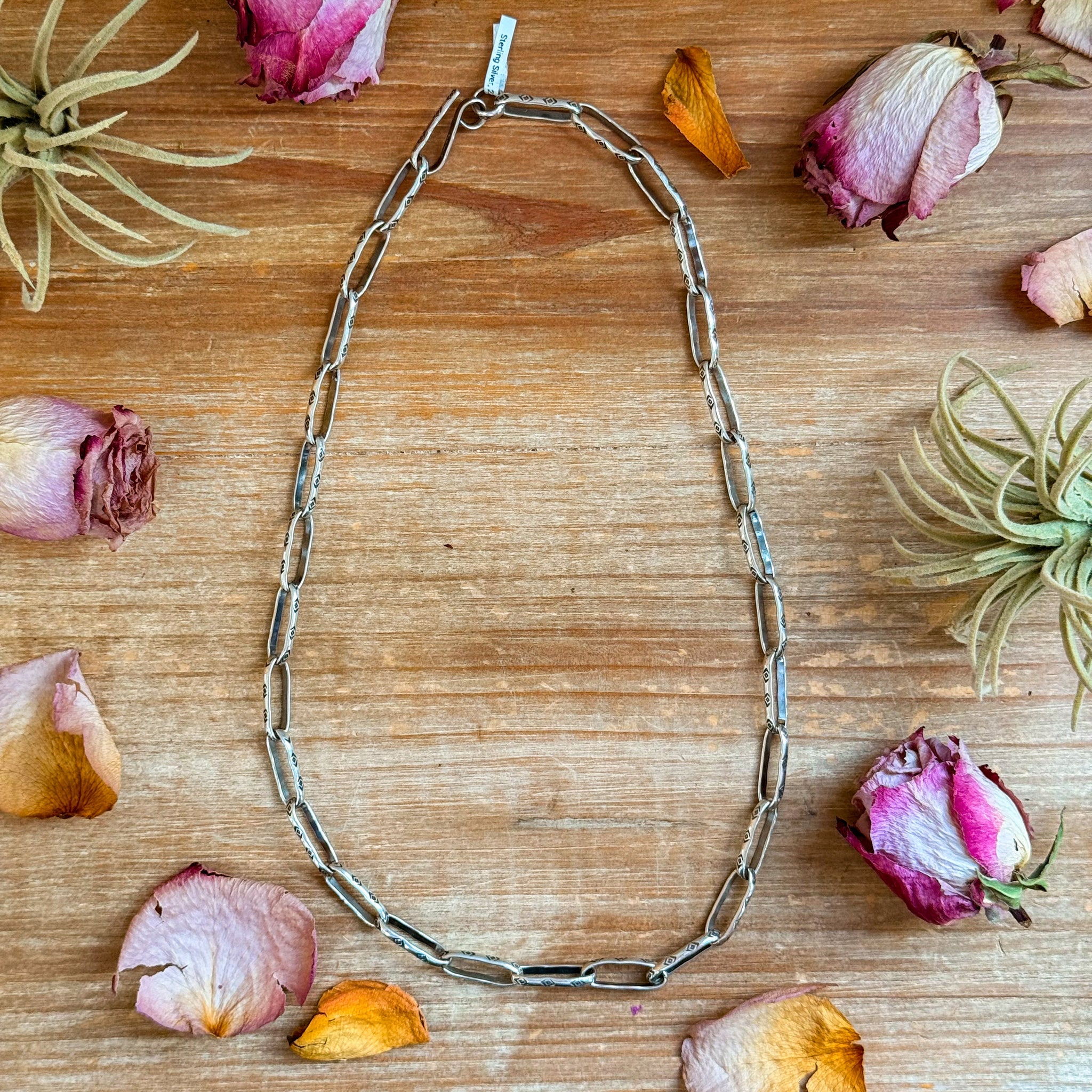 This sterling silver large paperclip link chain by artist Jason Ogg features his signature Medicine Man Eye pattern hand-stamped along each link. Measuring 22 inches, this chain offers the perfect balance of bold Western character and refined craftsmanship. Each link is individually formed and finished for a clean, heavy-duty look that stands beautifully on its own or pairs perfectly with pendants.